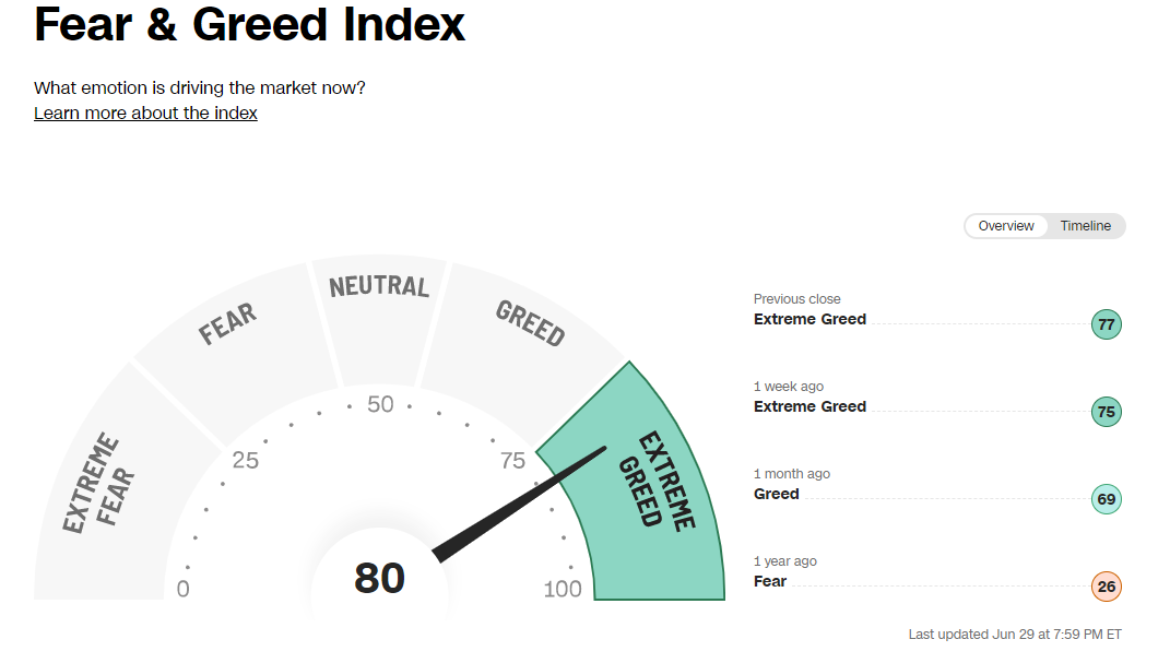 The “fear & greed” index, which I like to track as a shorthand for how the market is performing, is flashing “extreme greed.” I don’t think we’re quite there; broadly, valuations today seem reasonable to me. But one thing I’m certainly thinking about as we head into the back half of the year is reunderwriting all of my positions, making sure I really like everything I own, and feeling comfortable running with a little cash or taking advantage of very low volatility levels to buy some “disaster insurance”. It does sound a little silly to write “make sure I like everything I own” (when should you ever own something you don’t like?), but it is easy to buy a stock and have some thesis drift as you continue to hold it, and I just want to make sure I’m actively choosing to hold everything I own right now.