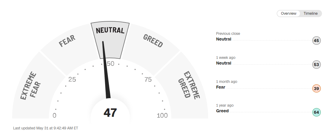 I like to use the CNN “Fear & Greed” Index just to quantify where the markets are; last month, we were tipping just slightly into fear. This month, we’re just out of the fear range: