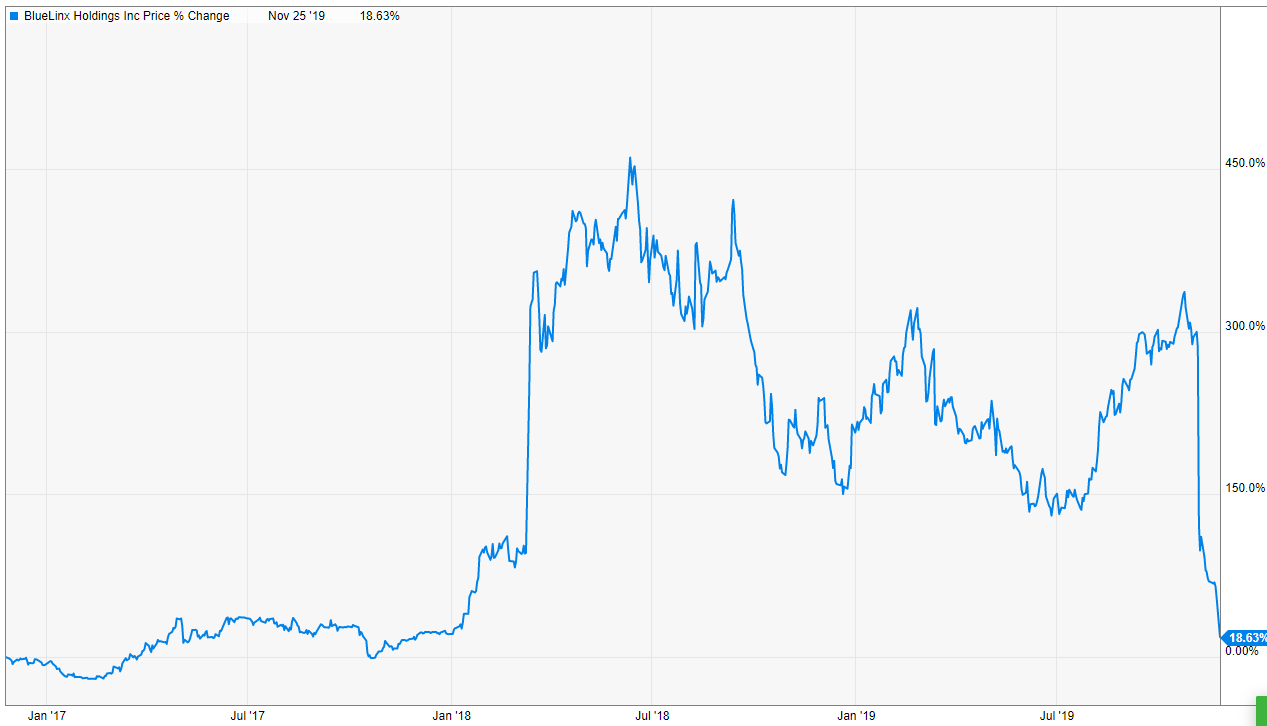 Anyway, I mention it this month because BlueLinx (BXC) has crashed back to earth recently (see stock chart below). BXC was a popular long in the value investor community for a while because (among other reasons) they owned a ton of properties that were probably worth ~as much as their entire EV (perhaps more). The stock skyrocketed when they announced a merger in early 2018 that had a mammoth amount of synergies, but this month the company has given basically all of those "merger gains" back as a disastrous Q3'19 earnings release and a subsequent shelf registration has caused investors to fear the company is on the verge of breaking covenants / facing a liquidity crunch that will cause mammoth dilution.