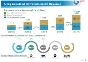 That bull argument does make some sense to me… but the chart below(from Gray’s September 2018 investor presentation) scares me. It shows the network’s share of retrans (“reverse comp”) rising from <30% of retransmission revenue in 2014 to almost 50% by 2017. My worry here is that both retrans and reverse retrans are relatively recent phenomena (the first time I saw retrans broken out in Nexstar’s 10-K was in their 2006 10-K when it accounted for 3% of their revenue (versus ~40% today), and the first time I see reverse comp mentioned in CBS’s 10-k is in 2012), and the quick increase from 30% to 50% of retrans in the slide below could suggest the networks just haven’t fully executed their ability to extract retrans so far. I think the vast majority of a broadcaster’s value comes from their network programming, so what’s to stop the network from receiving the bulk of retransmission fees?