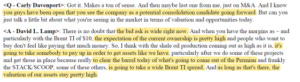 One general piece I wanted to highlight: Wyndham walked through how an independent would generally have an OTA contract 700-800 bps higher than Wyndham’s contract, and a mix shift of ~50% from OTAs versus the Wyndham system in the mid-20s. La Quinta was a decent sized chain, so the difference between Wyndham and La Quinta probably wasn’t as large as that example, but there will clearly be some synergies there that will eventually flow through to CorePoint.