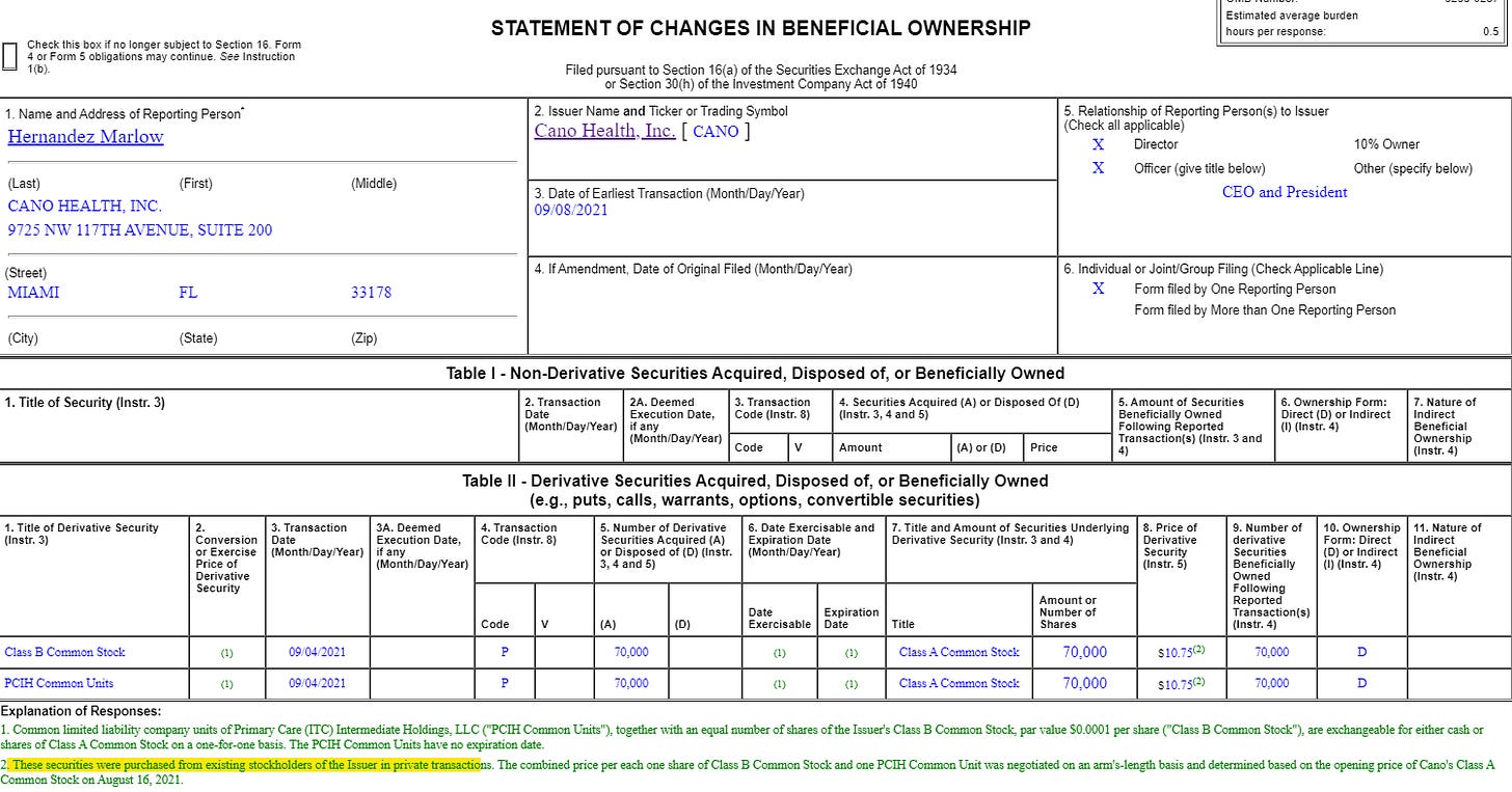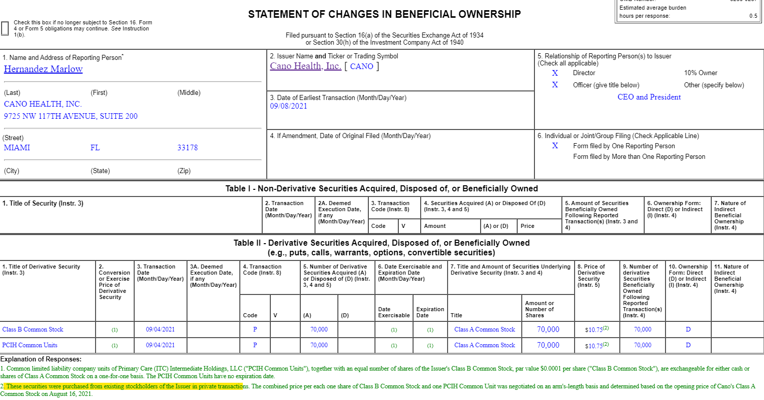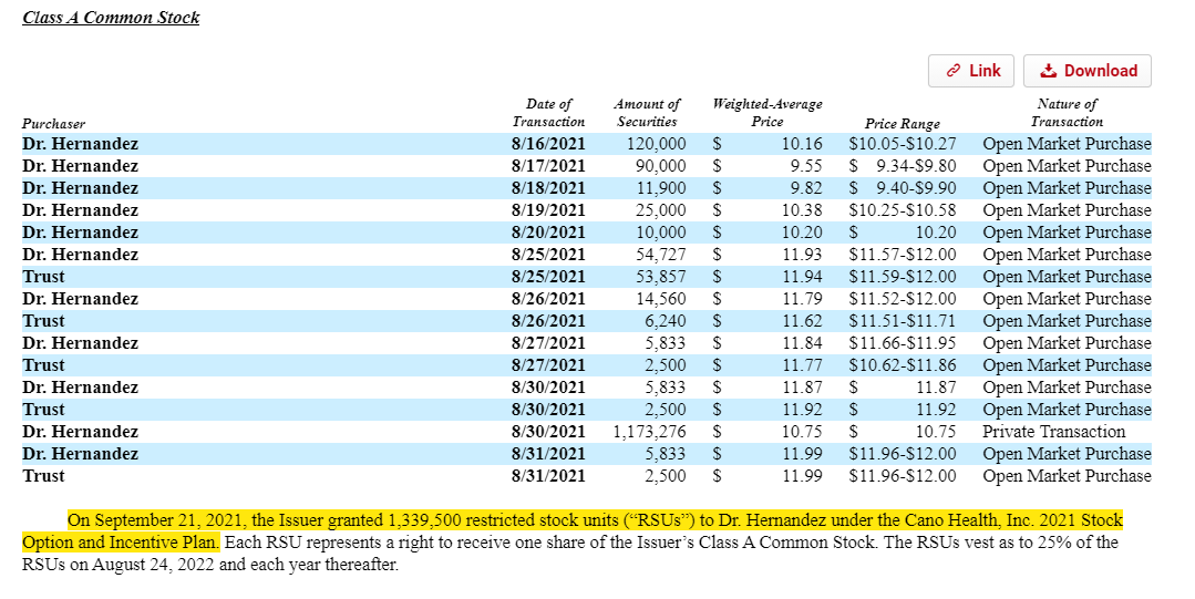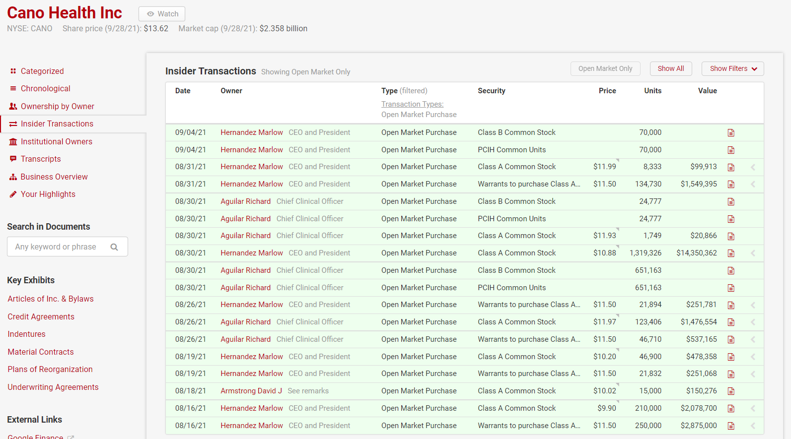 But I also mention because the degree of insider buys strikes me as somewhat aggressive and strange. If you just think about it, Cano struck a deal to deSPAC at $10/share, and the SPAC obviously has a bunch of warrants (struck at $11.50) associated with it. As part of the deal, Cano shareholders rolled 90% of their equity, but they did get 10% out. It just seems strange to me a CEO would agree to merge at that lower price, dilute himself, and take some money off the table… then turn around and aggressively buy shares in the open market at a higher price. IDK, maybe the recent string of acquisitions and regulatory environment change has him convinced intrinsic value is materially higher today than it was a year ago. If so, good for him for having the flexibility to buy higher! But the combo just illustrates to me why it’s hard to buy into a SPAC; if you’re buying, you’re buying higher than insiders were willing to sell / dilute themselves not too long ago. Actually, given the founder’s share dilution, you’re buying materially higher than insiders were willing to dilute themselves (unless the SPAC share price has really gotten crashed!)