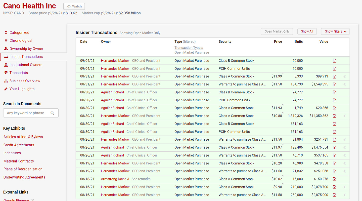 One of the more interesting insider buys I’ve seen recently comes from CANO. Cano merged with Jaws, a SPAC, earlier this year, and in the past month insiders have been pretty aggressive buying shares: