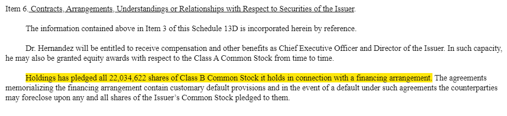 The other strange thing about the insider buying (and you could read this bullish or bearish) is that it appears to all be done on margin. The clip below is (again) from the CEO’s 13-d. It says that all of his shares are pledged in a financing agreement. Most companies have policies that prohibit execs from pledge more than a small amount of shares to financing, and for good reason: you don’t want the CEO stressed out and making stupid decisions because he’s going to get margin called and forced to sell a huge piece of his position if the stock goes down a little bit. So kind of insane that not only has he pledged all of his shares, but that he’s continuing to buy more on leverage.