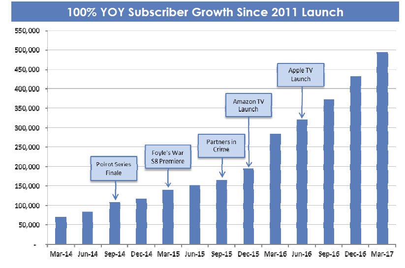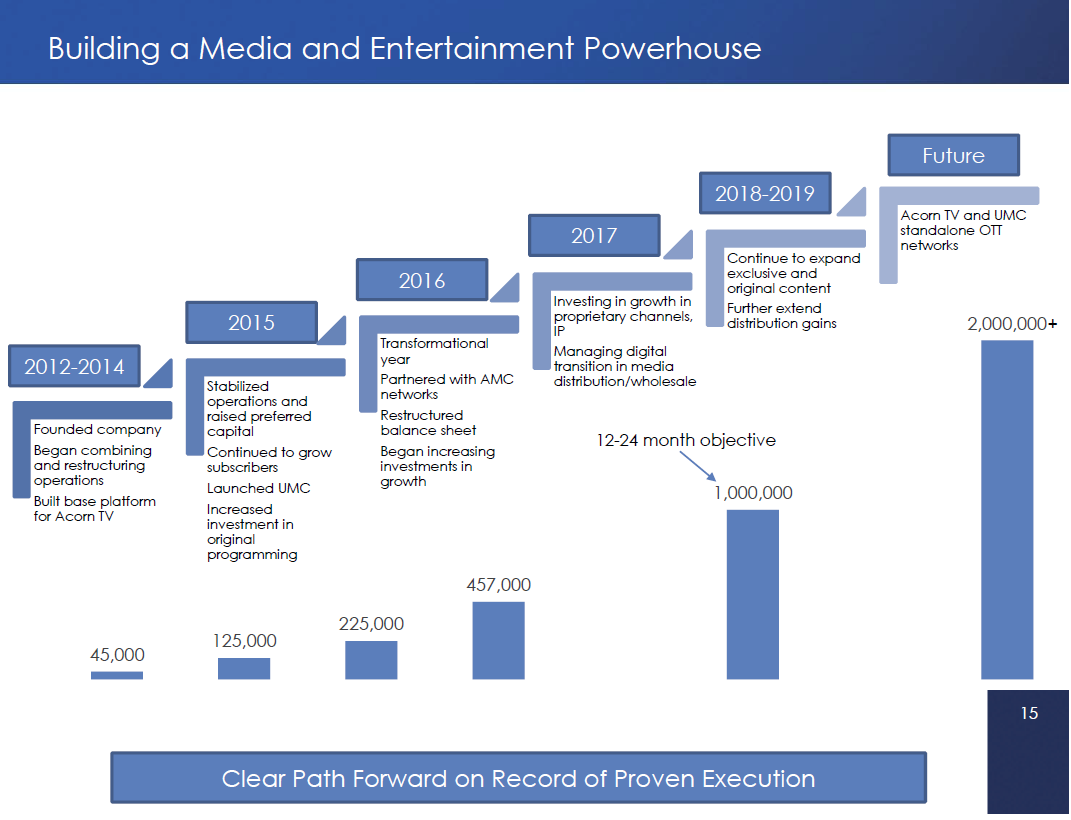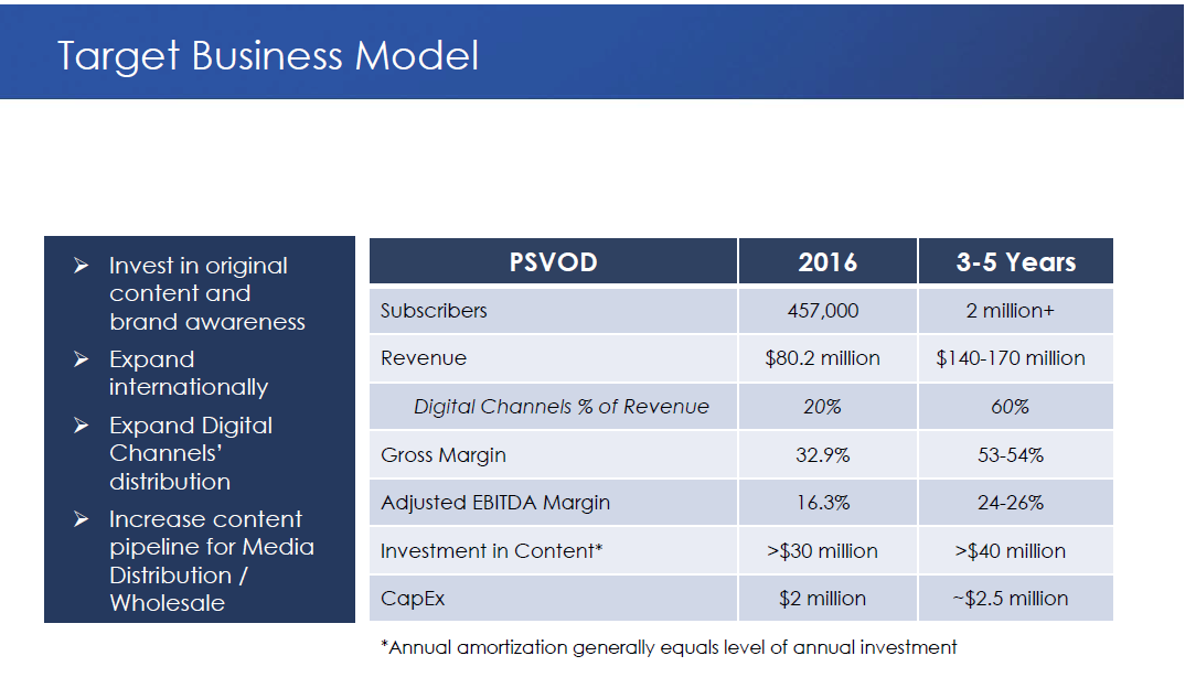 RLJE clearly has big hopes for Acorn / UMC. Their investor presentations list a one-two year goal of hitting 1m subscribers and a long term goal of over 2m subscribers generating $150m+ in annual revenue and annual EBITDA >$25m.