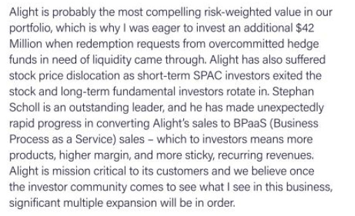 Let’s turn to the other company I wanted to discuss, ALIT (again, I mentioned them quickly last month). They report earnings tomorrow, so it’s entirely possible that they completely whiff and I look foolish for writing this. But I wanted to highlight it because I think it’s a nice example of why looking for sponsors who inject a ton of capital into a SPAC, particularly to cover redemptions, can be interesting. Recall that ALIT is sponsored by Cannae (CNNE), who wrote a $42m check to cover redemptions when they came in higher than expected a few months ago. Remember a SPAC sponsor can write a check to cover redemptions with asymmetric information; they can talk to the management team, be privy to internal strategy discussions, and then chose to write a check while having lots of material nonpublic information.