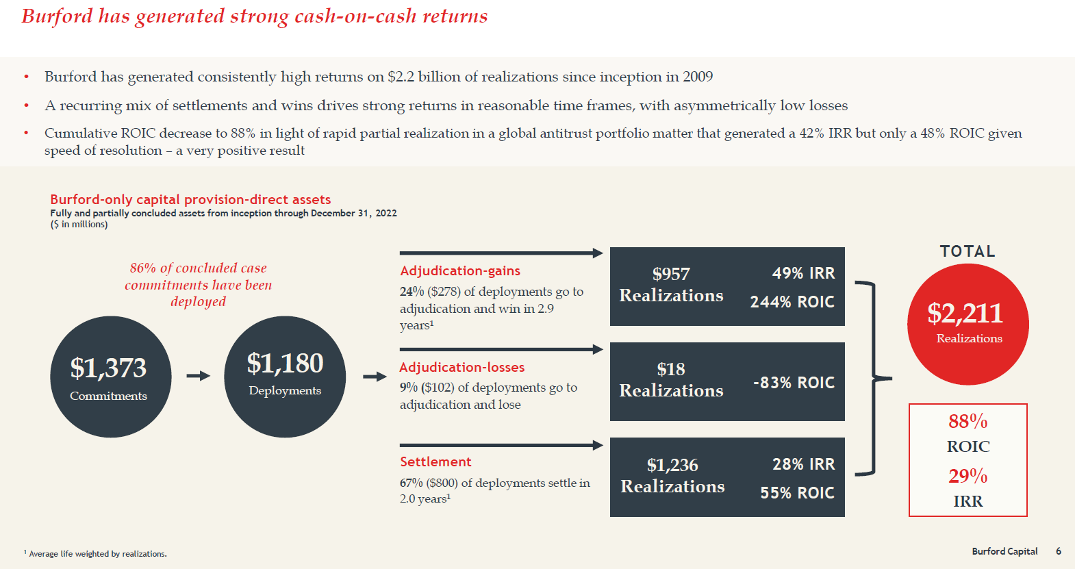 Burford’s historical returns have been incredible. They’ve realized ~29% IRR on the ~$1.2B they’ve deployed since inception (this return excludes overhead, but as noted on BUR’s Q1’23 earnings call they’ve generally done >20% ROE).
