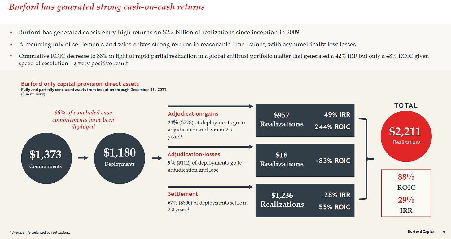 Seller sensitivity creates advantaged processes: the more bidders there are in an auction, the more efficient it will be. The argument here is that the sensitive nature of legal claims limits each process to only a handful of bidders (at most), and that allows for some “alpha” for the bidders. The example I like to use is this: say you’re selling a local business for $5m. You can basically hold a “bake off” where you invite every credible bidder to come look at your business and lob in a bid; anyone who can write a $5m check can diligence you, and you can sell to the highest bidder. In contrast, say you’ve got a legal claim that you want to sell. You can’t just open that up to the highest bidder; a lot of the information in a legal case is privileged or sensitive, and if it leaks out you could destroy your case or risk jail time. To limit leaks, you’ll probably only shop that case to two or three people, and you’re going to make sure that those two or three people are very trustworthy. Burford’s position as the largest litigation financer ensures they’ll be one of those handful of people that gets a call, and being involved in processes with only a handful of buyers tends to create good economics.