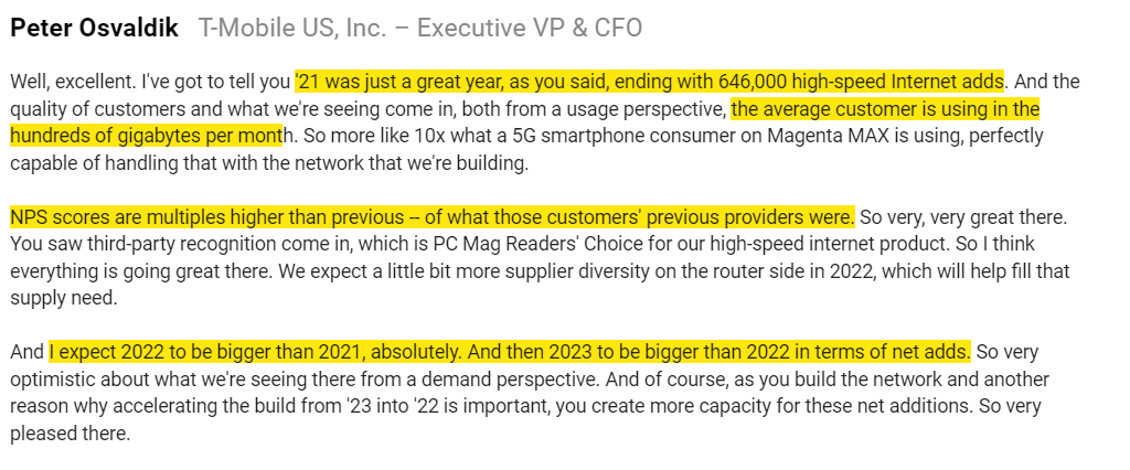 Moving from a hypothetical to real world numbers shows how scary this risk is. In Q4’21, T-Mobile added more high speed internet customers (224k high speed customers in Q4) than Comcast (CMCSA added 212k). T-Mobile is adding exclusively fixed wireless customers, so their fixed wireless is growing faster than Comcast’s traditional broadband (and T-Mobile’s has said they expect adds to accelerate YoY in both 2022 and 2023).