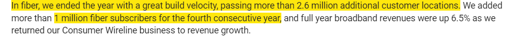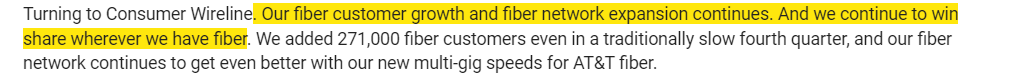 On top of the fixed wireless competition, you have FTTH buildouts continuing to ramp up. AT&T, Verizon, and a bunch of smaller players (LUMN, FYBR, CNSL, etc.) are all making concerted pushes to upgrade their legacy networks from copper / DSL to fiber. Investors are terrified by this investment; in a cable / DSL market, cable is basically a monopoly (not a lot of people want to sign up for DSL’s 25 meg down / 3 meg up speeds in today’s world!). But once the DSL players upgrade to fiber, suddenly cable goes from basically having a monopoly in a territory to competing against a superior product (fiber is a little lower cost to operate than cable, is symmetrical so it has better upload speeds, and it has better theoretical max speeds / is easier to upgrade speeds as consumer demand increases). (The clips below are from T’s Q4’21 earnings call just to give you a feel for how telecoms are accelerating their investments into fiber networks).