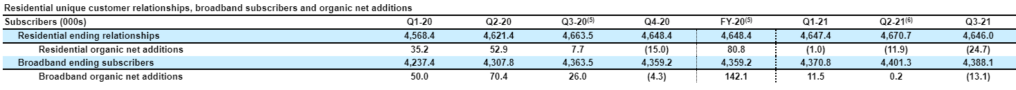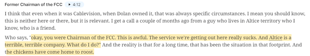 Altice has, by far, the most competitive footprint in cable since so much of their territory has been overbuild by Verizon FIOS Fiber. Since the height of the pandemic, Altice has basically been treading water on broadband subs and in Q3’21 they switched from “treading water” to actually losing subs. Investors see rising FTTH competition for all cable players and worry that Altice’s results now are a preview of what all cable players will report in a few years.