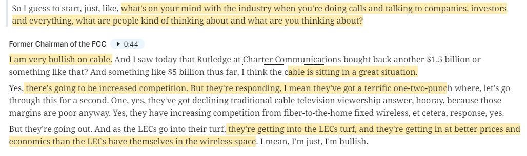 Anyway, for my first Tegus deep dive, I figured I’d turn to a familiar sector: Cable. I’ll explain why I chose cable in a second, but let me start by highlighting the three expert interviews I did for this series (note: for the next year, these links should give you access to the calls even without a Tegus sub, so it’s a great trial even if you’re not a sub!):