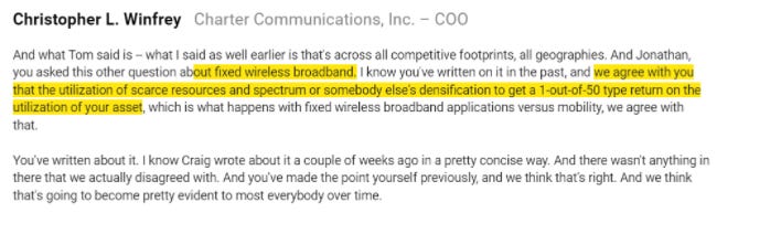 The cable companies have frequently pointed this out. For example, Charter’s talked about how wireless companies are going to face a trade off between using their scarce resources (spectrum) to support either a fixed wireless product or add mobile subs.