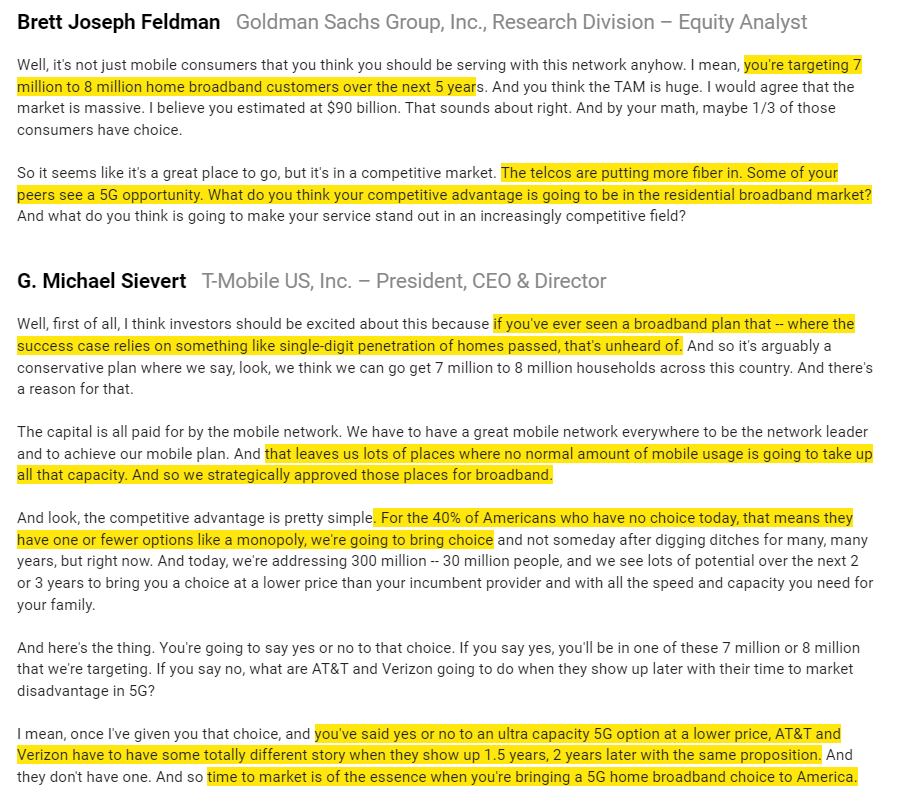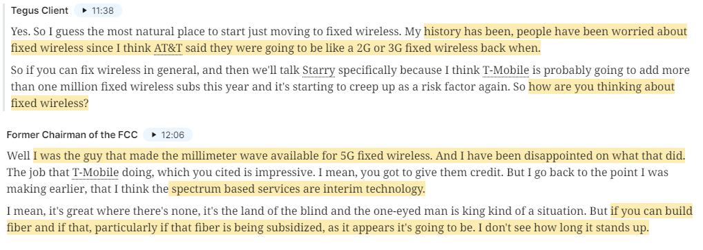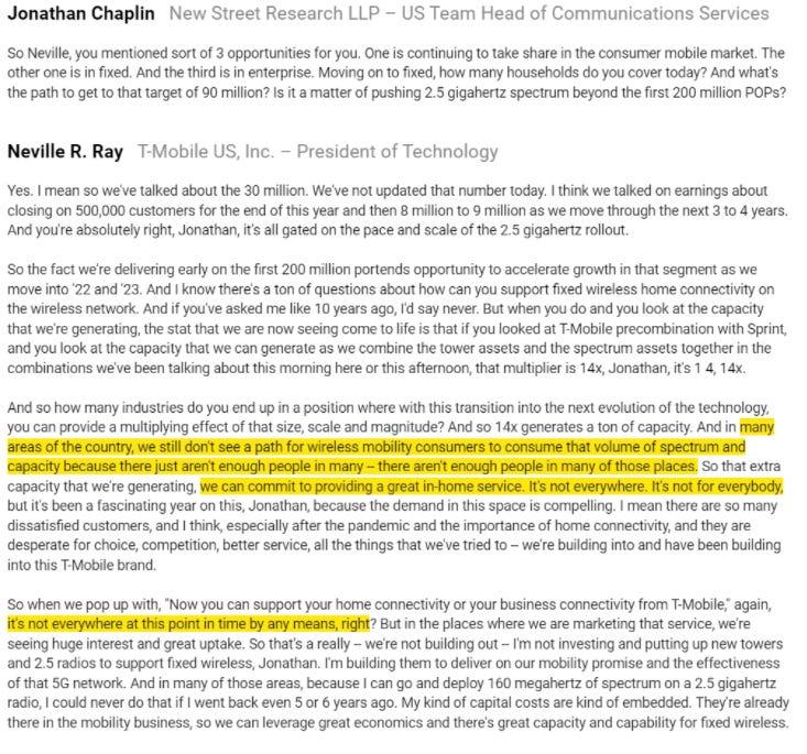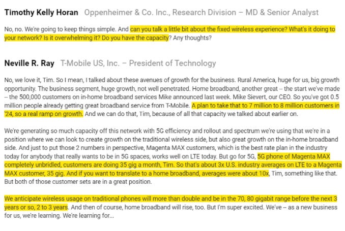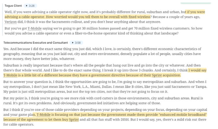 Well, first the Tegus experts seemed to agree with me that TMUS only made this fixed wireless plans because it helped them get their merger through.