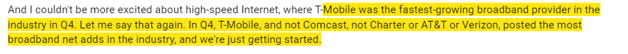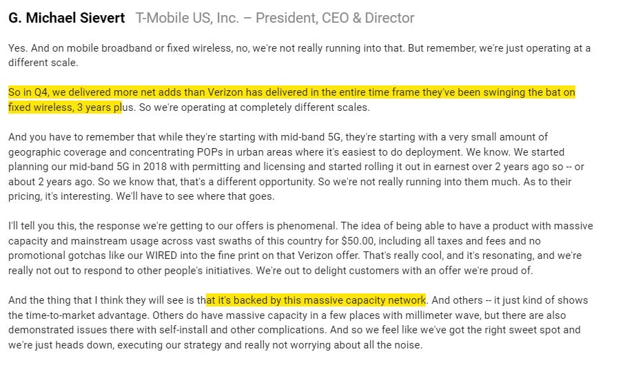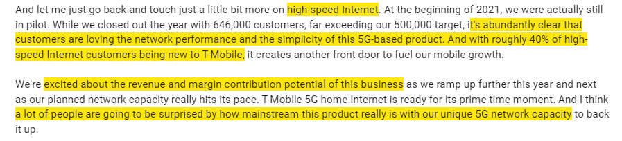 But diving deeper we can look a little closer at what TMUS is saying about fixed wireless now that their merger has been approved. Here they are at a conference in November 2021: