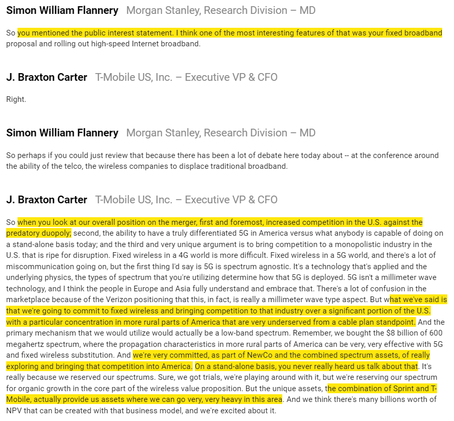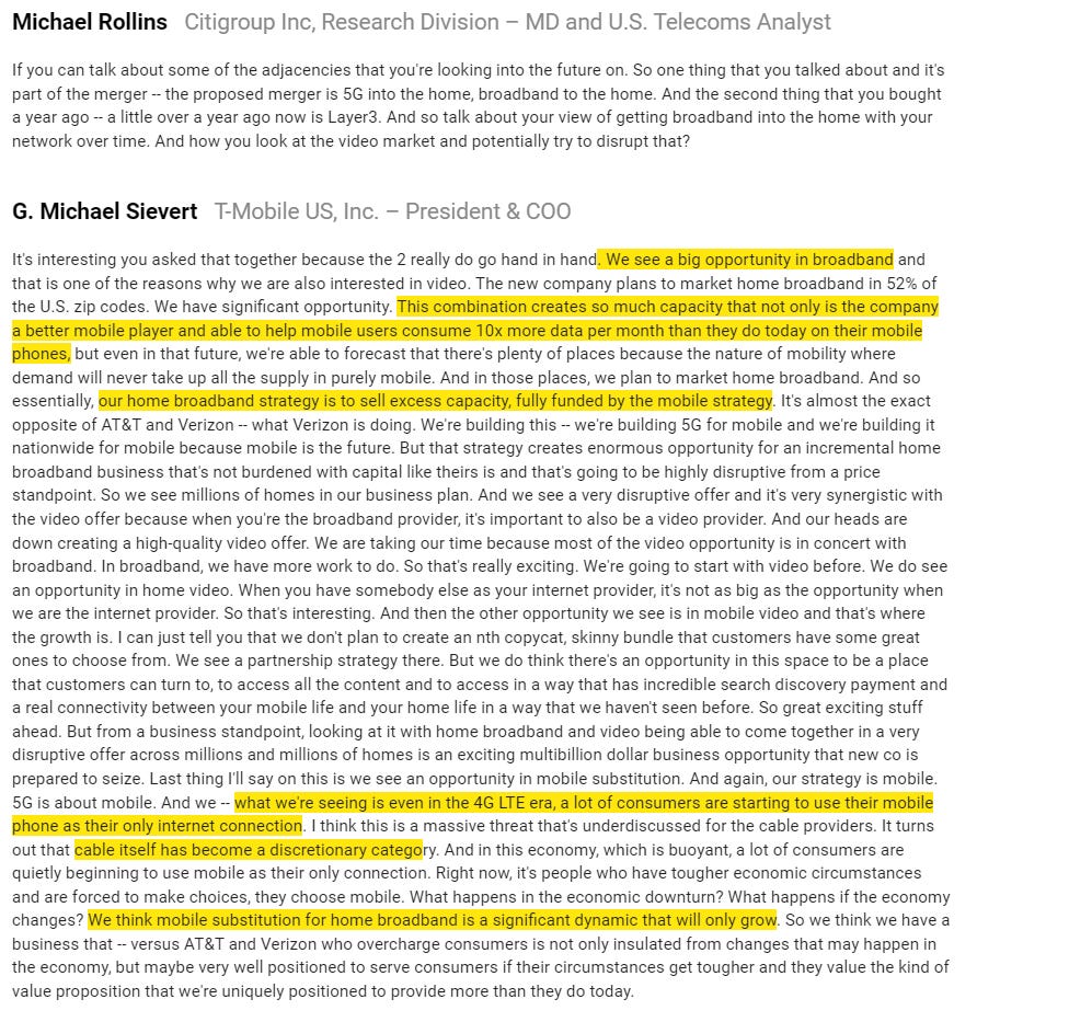 So compare the 2017 quotes above to how TMUS starts talking about their fixed wireless plans post merger (and note in particular that the first time they really start hammering that home is in their public interest statement (the thing you file with regulators for why they should let your merger go through)).