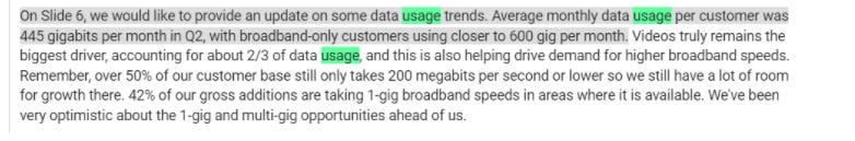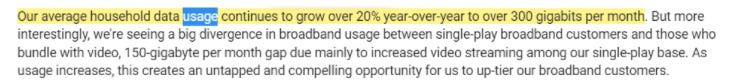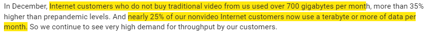 Fast forward to Q2’21, and the average ATUS customer is doing 445 gigs/month, with broadband-only customers consuming 600 gigs.