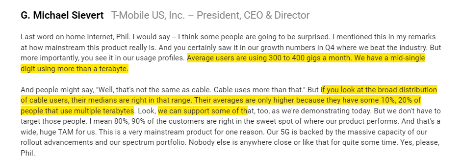 TMUS is in a unique spot here; their Sprint merger gave them a ton of excess capacity for now. They can use that to support a fixed wireless service (again, for now), but as data usage continues to grow the fixed wireless component is going to be less and less relevant.