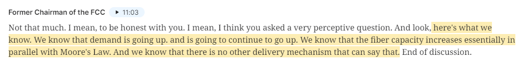 So TMUS’s rapid fixed wireless growth is a new concern… but fortunately for cable bulls, I don’t think that fixed wireless is a real long term threat to cable. There are lots of reasons for that belief, but a core reason is simple belief in physics: cable (and FTTH) have a wire directly into your home / office / the places where most data is consumed. That is always going to be the lowest cost, fastest, and most reliable way to deliver data. I liked how one of the experts framed it: