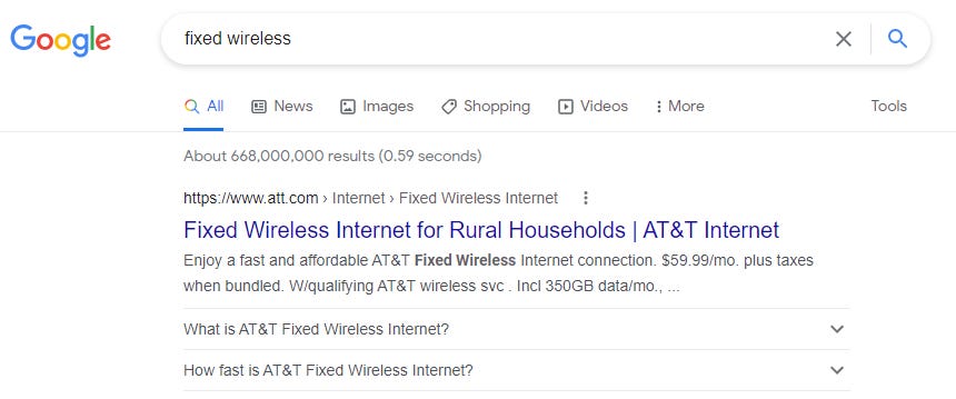 Humorously, AT&T seems to back this talk up with their marketing. When I googled “fixed wireless” this week, look what the top result was: AT&T “fixed wireless internet for rural households.”