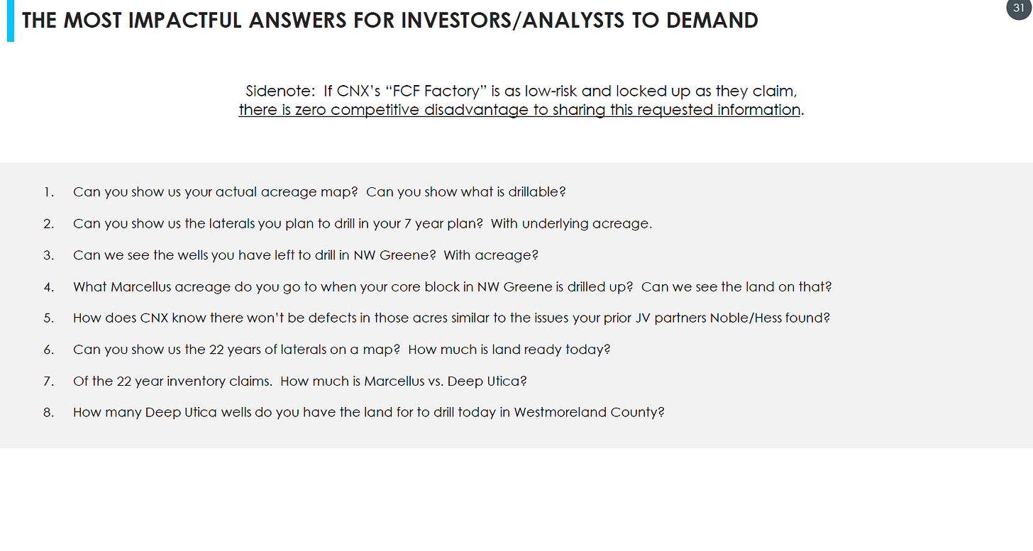 In regards to the CNX short report, the expert was pretty skeptical. Scattered acreage is pretty common in the industry; in fact, the expert suggested that scatted inventory can be beneficial versus having a fully concentrated position.