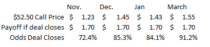 Well, we can use the options market to get a good idea. Twitter has $52.50 calls that will pay off for $1.70 if this deal closes ($54.20 deal price less $52.50 strike price); we can use the price of the options across different months to see the odds the market assigns to the deal closing before a given strike expires. For example, the November $52.50 call last traded for $1.23. $1.23 divided by the $1.70 payout gives a 72.4% chance the deal closes.