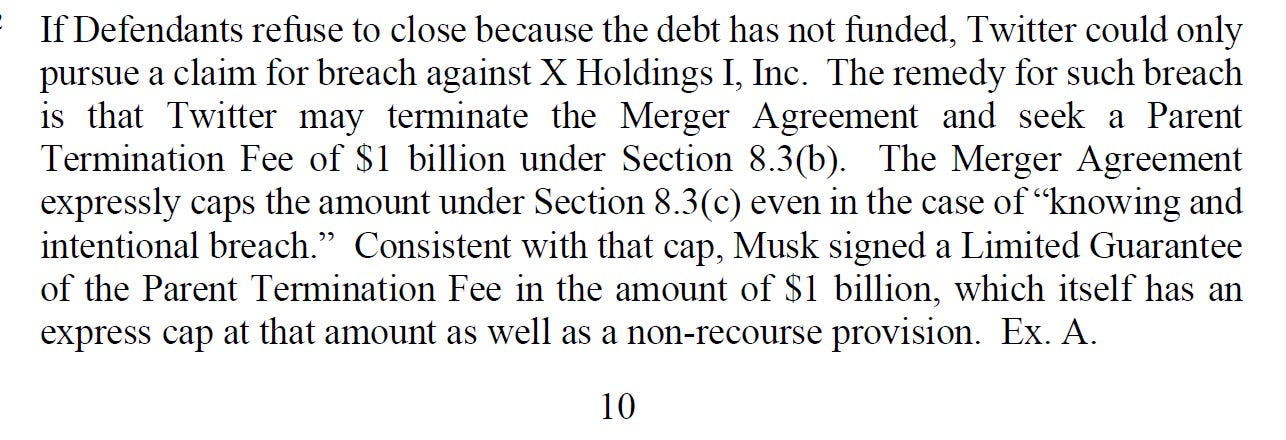 So that leaves financing and insolvency as outs Musk could argue if he doesn’t close this month. The arguments here are simple: the TWTR merger agreement includes a $1B termination fee if financing falls through, and Musk’s agreement with X Holdings (the merger sub) specifically says that he only owes the sub $1B if debt financing isn’t there (see screenshot below from Musk’s motion to stay).