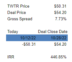 But then something strange happened: I broke my Michael Myers from Halloween rules (don’t consider him dead till you see a body / don’t count consider the deal done until the money is in your account) and took a victory lap on TWTR… yet the market (and everyone I talk to) fears that this deal is not quite done yet. As I write this, TWTR stock is trading for $50/share. That’s a ~8% gross spread for a deal that is scheduled to close in ~2 weeks (or less; don’t forget this could close at any time)! The IRR on the deal to close is… well, using IRR for short time periods can lead to some funny numbers, but goodness is an IRR over 400% an eyepopping number!