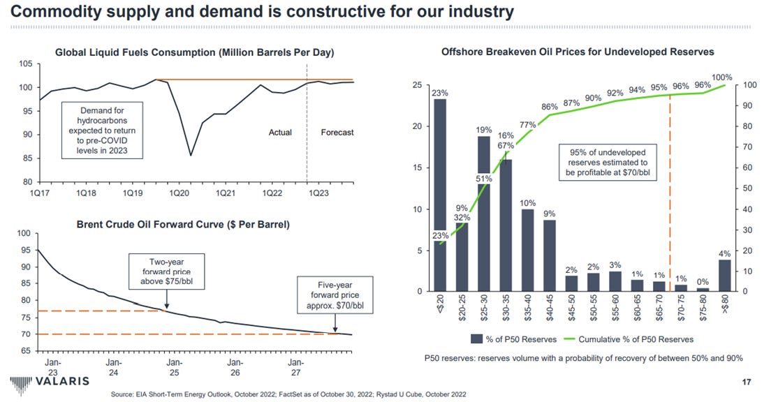 Anyway, the slide below is from a recent VAL deck; it shows the rough oil breakeven for the offshore sector. You’ll see that >90% of projects are profitable with oil prices at $50-$55/barrel.