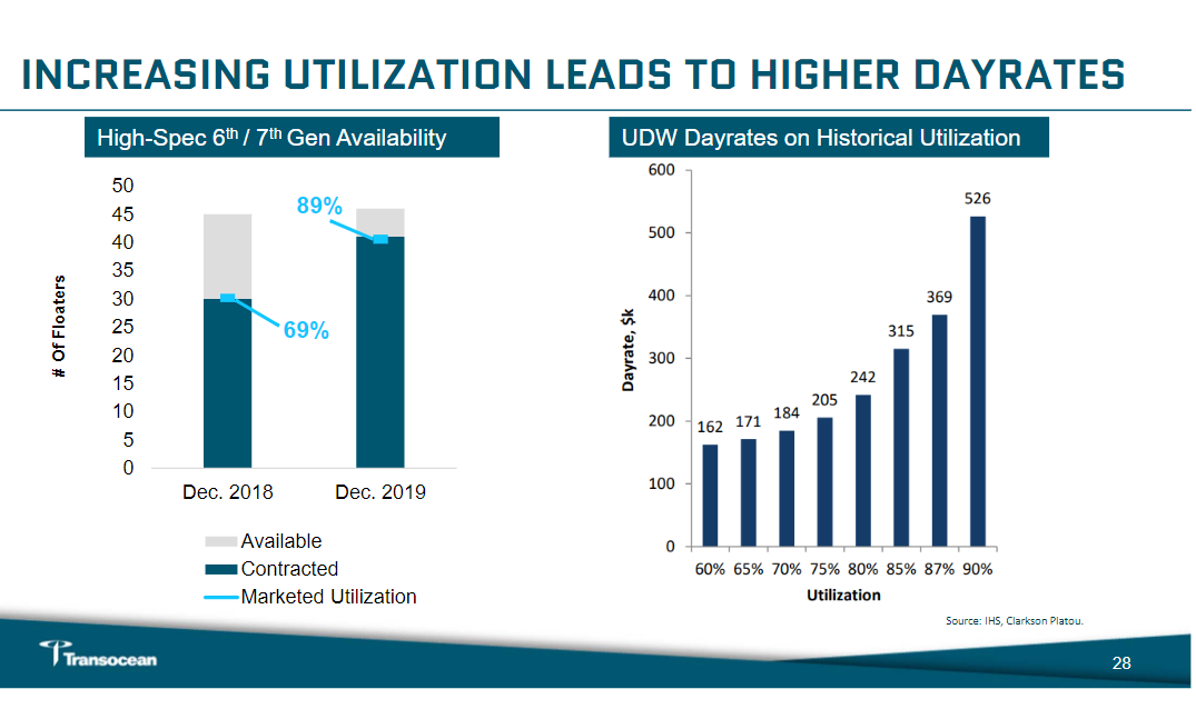 I’m going to attempt to answer that in a second, but before we do that, just keep one thing in mind: offshore drilling is a massive investment. Near term spot oil prices obviously factor into the thinking / economics behind it, but when companies are committing tens or hundreds of millions or even billions of dollars to offshore projects that have >decade long lives, they are doing it with an eye on out year oil prices, not the day to day fluctuations of spot year prices. I only point that out to emphasize that if you see a CNBC headline “oil down 10% (or up 10%) on (insert your preferred geopolitical event here”, it has some impact on supply / demand at the margin but it certainly doesn’t change the thesis (unlike with some nearer term oil/energy plays, where spot price swings can have massive implications for their cash flows and value).