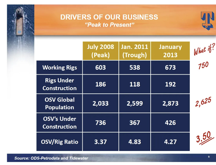 I don’t want to beat you over the head with this idea, but I did start the series off with two Tidewater focused podcasts (episode #146 (with Tidewater’s management) and episode #147 (with Judd Arnold)), so I just want to show a few slides from Tidewater’s past to illustrate this point a little further and drill into it. The slides below are from a TDW 2013 investor deck.
