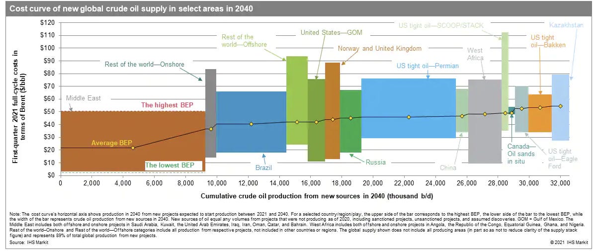 Just to dive in a little further into what the forward market is predicting on the supply / cost side, S&P has a piece forecasting global oil supply and cost out to 2040; you can see it below. If you think the forward price is wrong because of supply, you need to think one of the buckets below is too small (i.e. the middle east can produce 14m barrels/day at reasonable cost, not ~9m) or that there will be a new bar on that chart when someone runs it again in 2030/2040 (if you produced this chart ~15 years ago, the light blue “US Permian” source would not be on it!).