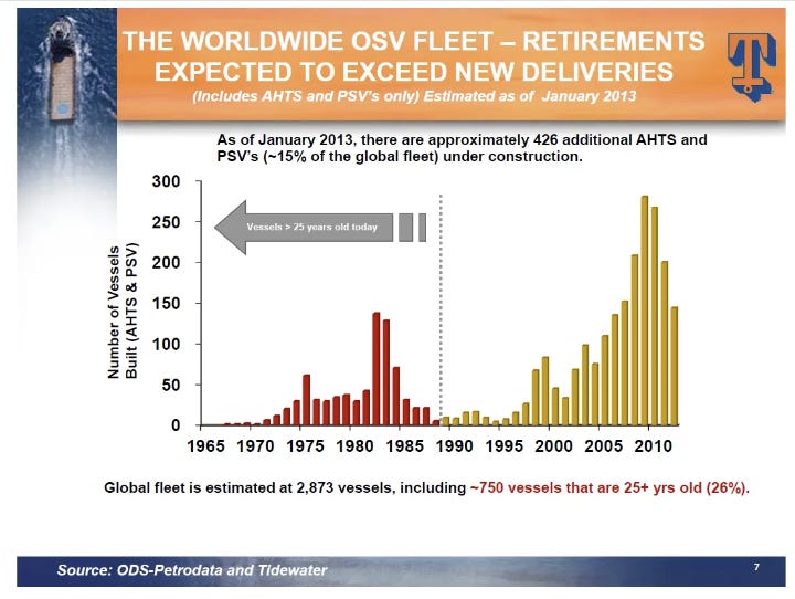 There is some basis for this fear given this is exactly what happened in the mid-2010s bust (though falling oil prices thanks to shale played a role as well). Look at the slides below from TDW’s 2013 investor deck; they are bragging about bringing on 29 new build boats (>10% of their fleet size) right before the whole market is about to fall apart!
