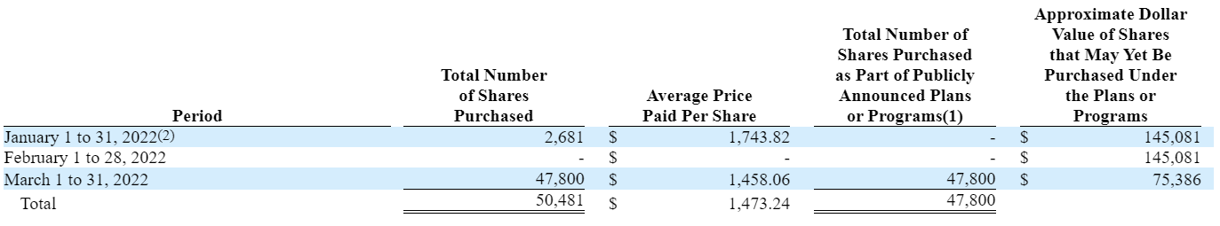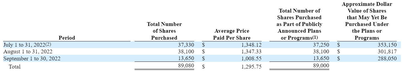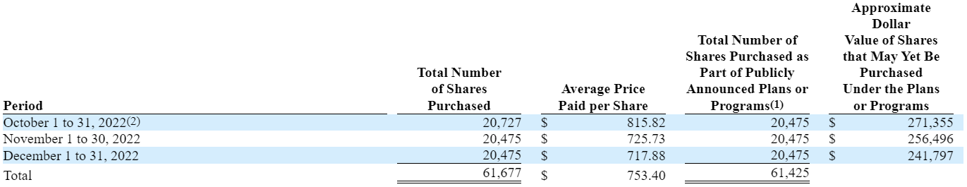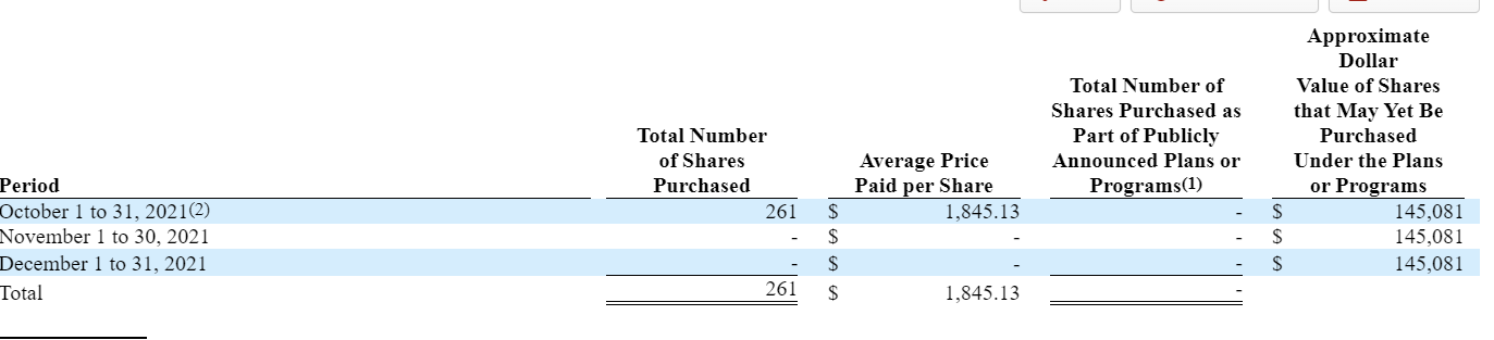 Consider Cable One (CABO). I had their CEO on the podcast recently (see here; she was great), and we discussed a lot of things about the company and industry. For this section’s purposes, the most important thing was how Cable One started buying back shares reasonably aggressively in 2022 after sitting out the repurchase game for years. Every company reports their share repurchase activity (if any) in their 10-K. I’ve pasted CABO’s most recent 5 below; remember that CABO has <6m shares outstanding, so the ramp up from basically no share repurchases when shares are in the high teens to a pretty aggressive rate as shares drop into the low teens and ultimately below $1k/share is very interesting!