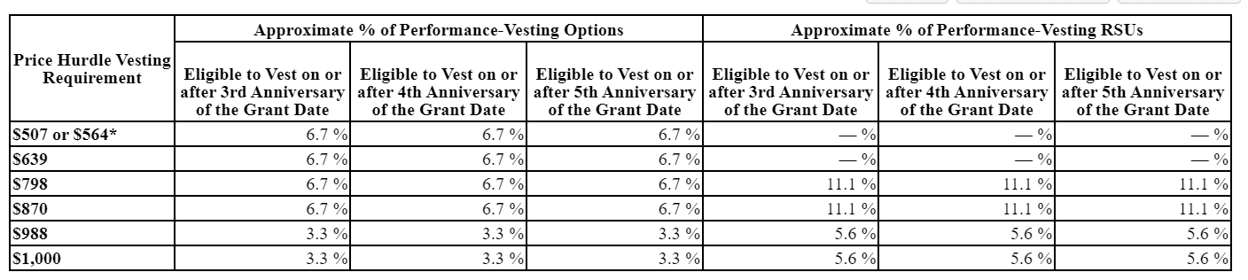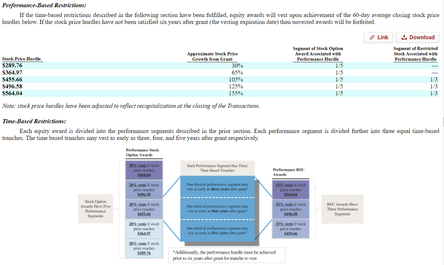 Management has chosen to forgo 5 years worth of bonuses to get these awards. They need the stock to appreciate ~8%/year over five years just to hit the lowest end of the awards…. and even if they hit that target, the opportunity cost versus just taking normal yearly bonuses is huge. In order for these awards to make sense, management is betting that the stock needs to go up a lot and do so in a pretty tight time frame.