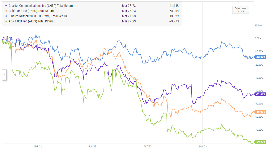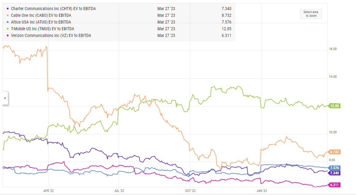 Those charts are just absolute disasters. You can probably blame part of the massive decline on interest rates; cable is a little more sensitive to interest rates than your average company (most cable companies run with some leverage, and at their core the bull case for cable companies is they are like bonds with pricing power. That combination leaves cable companies more vulnerable to interest rates / multiple compression that an average company). But there’s clearly something else going on here; cable companies saw their multiples get slashed drastically, going from ~10x EV / EBITDA (or higher for CABO) to ~7x, which is roughly inline with where T and VZ trade (TMUS, which is still realizing synergies from their merger with S and which has a compelling growth story given their best in class network, lots of spectrum, and their success with fixed wireless trades at a premium).