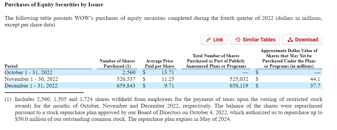 One more sign the industry is cheap. WOW is not a perfect comp versus the other players (it’s an overbuilder and a fraction of the size of the other peers), so take this with a grain of salt…. but their share repurchase activity is interesting. WOW is by far the least levered of the cable players, so they could have been running a reasonably aggressive capital return / share repurchase strategy whenever they wanted to. They also have a private equity firm who owns~37% of their shares and has been in the company for almost ten years at this point, so they are certainly very sensitive to value creation. Despite massively delevering their balance sheet in 2021, WOW sat out the repurchase game… until the end of 2022, when they started aggressively buying back their shares (WOW has <90m shares outstanding, so they suddenly ramped their repurchases up to a level that would have them retiring just under 10% of their shares/year) (table below from WOW’s 10-k).