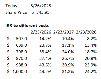 The table below shows the IRR for the stock needed to hit different vest levels.