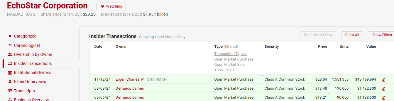 Echostar (SATS) has to be mentioned in any spectrum discussion. SATS is the combination of Echostar + Dish; Charlie Ergen spent years buying billions and billions of dollars worth of spectrum at Dish, but Dish eventually found themselves overlevered and needed to merge with Charlie’s other company (SATS) to get more liquidity. With the near term liquidity concerns settled by the merger, the upside is enormous if SATS / Ergen can figure out a way to successfully monetize the spectrum. That is an enormous IF, but there is a reason that almost every telecom regulator / executive says “don’t bet against Charlie” when someone mentions him… and Charlie is certainly betting on himself given he bought ~$50m of stock late last year: