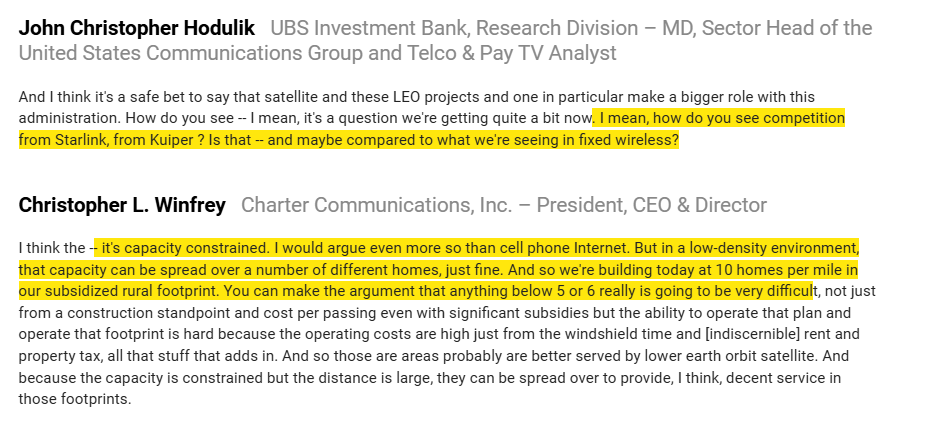 On the rare times when cable companies would talk about competition from satellites, it would generally be along the lines of “yeah, it might work in some really rural applications that are too far from a network to build a fiber/cable line to, but it can’t compete against fixed infrastructure…. it’s just too capacity constrained.” Don’t take my word for it; the below (from Charter’s CEO back in December) is probably the most generous you’d hear a cable executive talk about satellite internet.
