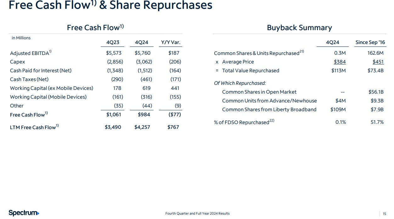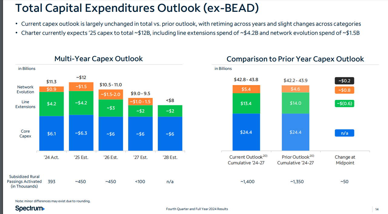 EBITDA: my “low single digit” EBITDA growth rate could prove conservative… Charter has historically talked about mid-single digit or better EBITDA growth rates, and it’s reasonable to think they get back to those numbers as they fully lap some of the headwinds they faced in 2024 (ACP expiration, continued investment into wireless, perhaps some competitive intensity comes down as fixed wireless matures).