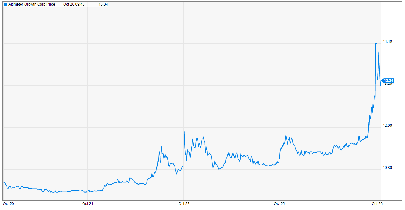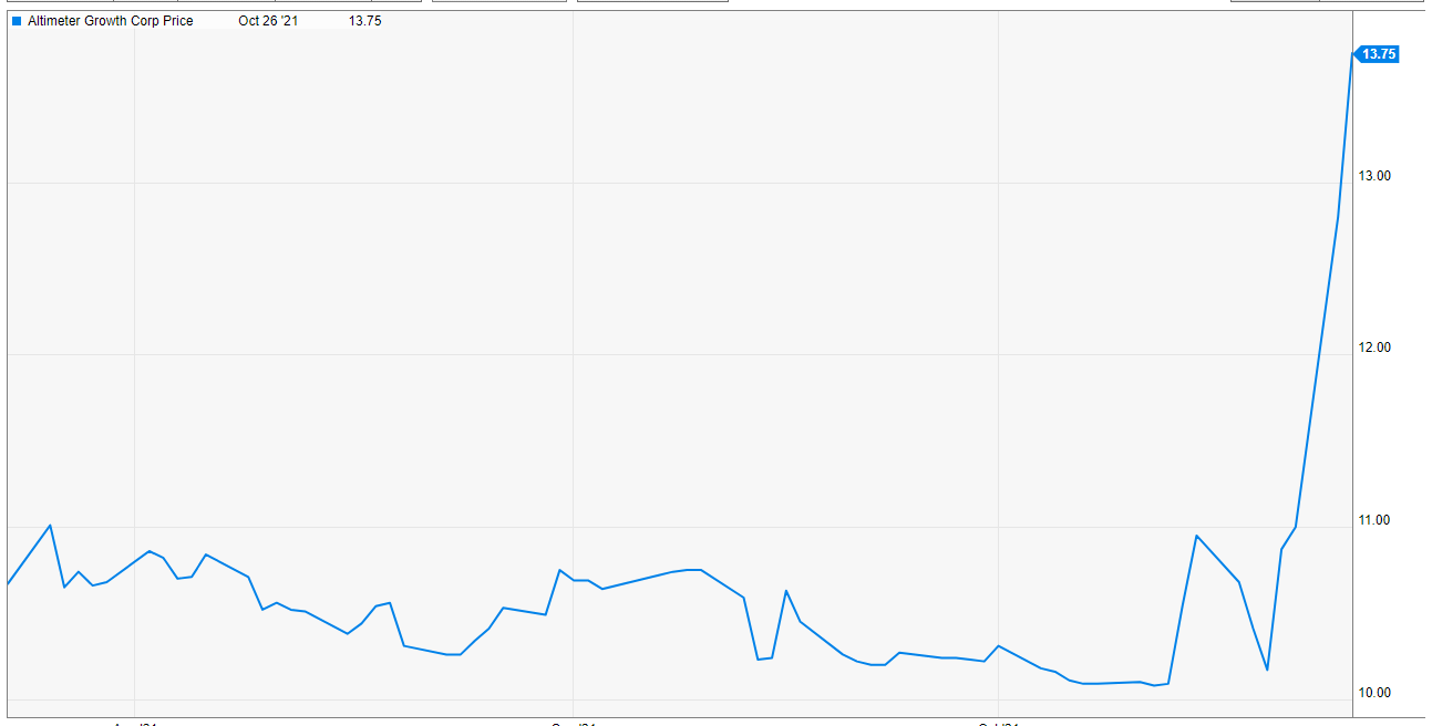 AGC price: AGC announced a deal to merge with Grab, Southeast Asia’s “leading Super app,” back in April. The deal should close by the end of the year. The stock had been reasonably range bound between $10-$11/share for the past three months, which in this market actually spoke to a much better than average SPAC deal. However, in the past three days, AGC stock has spiked (from ~$10.50/share to just under $14 as I write this) on no news I’m aware of.