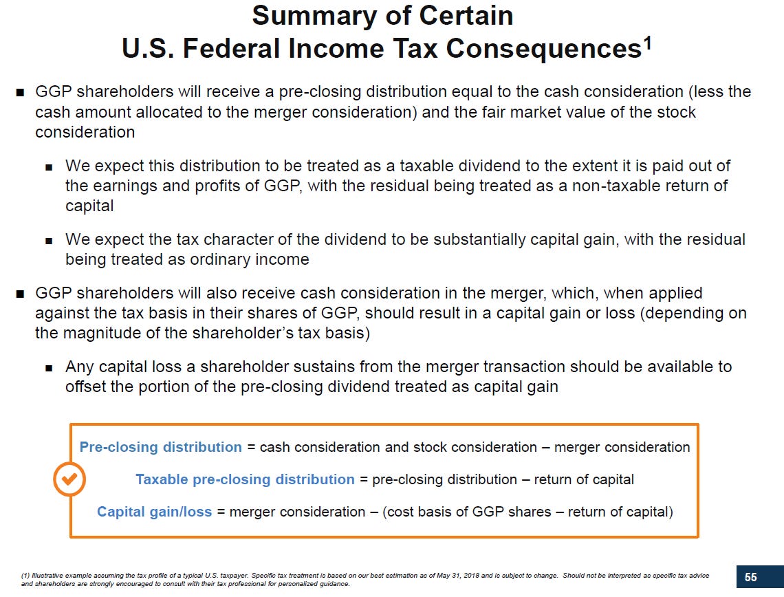 “we've been getting a number of questions as it relates to that specific topic. So I'm just going to try to summarize what we've included in the proxy and of course, I'm going to end up with a caveat. But really, first off, a GGP shareholder will receive a pre-closing distribution of cash consideration and stock consideration. This is assuming proration for simplicity in this example, that will constitute a dividend to the extent that it is paid out of the earnings and profits of GGP. It is expected that this distribution will be substantially taxed as a capital gain with the balance as ordinary income. In addition, you'll receive a small amount of merger consideration, which we outlined in the proxy as part of this transaction. This merger consideration, when applied against the tax basis that GGP shareholders has in their GGP shares, will result in either a capital gain or a capital loss. Any capital loss from applying it against merger consideration can be used to offset the capital gain received as part of your pre-closing distribution. And then on a go-forward basis, your BPR or BPY units that you receive as consideration will have a basis that's equal to the fair market value at the time of the transaction close and pre-closing distribution. So I will say that certain aspects of these tax consequences of the transaction are not entirely clear, so we do urge anyone working through this to consult your tax advisers. In addition, we do have more complete discussion of these consequences in the proxy and S-4, and we would also urge everybody to reference that as well. So hopefully, that gives you a sense.”
