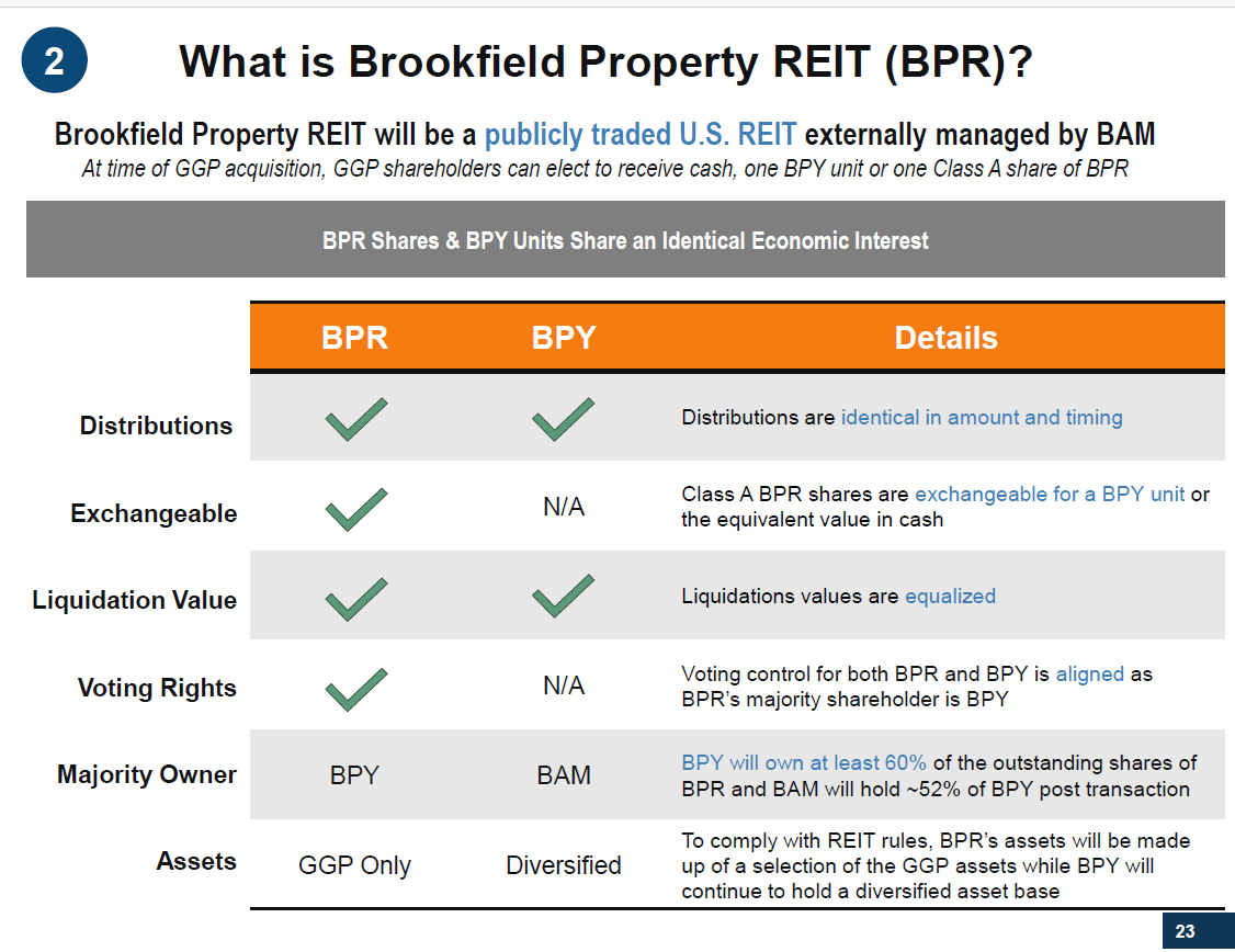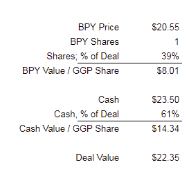 BPY (which is controlled by BAM, which I am long) is acquiring GGP (disclosure: long) for a headline price of $23.50/share. However, as so often happens in conflicted takeunders, the headline price has nothing to do with the actual value GGP shareholders will receive. GGP shareholders can actually make an election to receive either $23.50 in cash or one “BPY unit or BPR share” (I’ll discuss those shares in a second) which will be prorated so that the total consideration comes out to 61% cash and 39% equity. With BPY shares currently trading for $$20.55, the transaction is currently worth ~$22.35/share