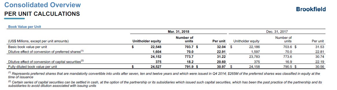 Again, at today’s price BPY trades for $20.55. As of March 31, 2018, BPY marked their diluted book value at $30.97/share (see chart below). Diving too far into BPY’s valuation is a bit beyond a focus on a special situation so I’ll just say this: I don’t think BPY deserves to trade for NAV (they’re externally managed, and you need to adjust some discount for that contract), but I think BPY’s current discount is way too wide (I’m not 100% sure how wide- my gut says BPY should trade for a ~20% discount to NAV, but BAM is a good operator and BPY has a lot of fee credits that makes the management contract pretty cheap currently so you could probably talk me into a 10%-ish discount). BAM appears to agree with me that BPY trades too cheap: they’ve consistently talked about how undervalued they think BPY, BPY is by far BAM’s largest investment, BPY has historically had a decently active share repurchase program going given how high insider ownership is, and, in my talks with IR, they’ve been pretty clear they want to step up the BPY share repurchase program after the deal closes.