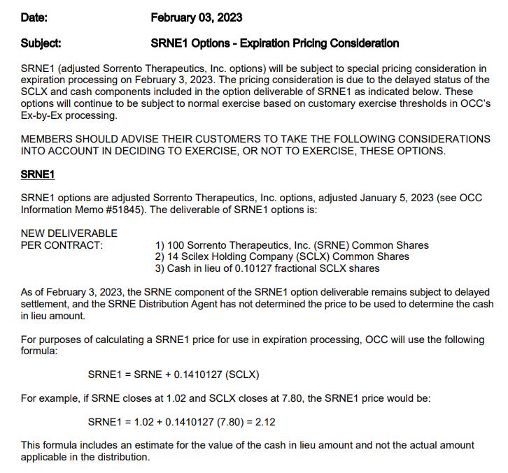 But maybe there is! The SCLX restricted stock is a really funky security; the OCC has needed to publish basically weekly memos to explain how to adjust legacy SRNE options for the SCLX position (I’ve included a sample one below; you can find them all on the OCC site by looking up SRNE. Side note: I’m confused why the OCC decided to adjust the SRNE options for SCLX normal common when the dividend was of restricted common, but whatever).