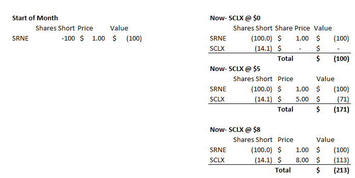 That value mismatch probably doesn’t make a big difference for people who were long SRNE… but if you were short SRNE, it could make a big difference for margin. Consider: if you were short 100 shares of SRNE at the start of the month, those shares were worth $100 in total. If you still hold that short, it could be worth anywhere from $100 to $213 depending on if your broker is marking the SCLX restricted shares at $0 (i.e. not valuing them), $5/share (valuing them at dividend price), or $8/share (valuing them at market). That’s a mammoth swing!