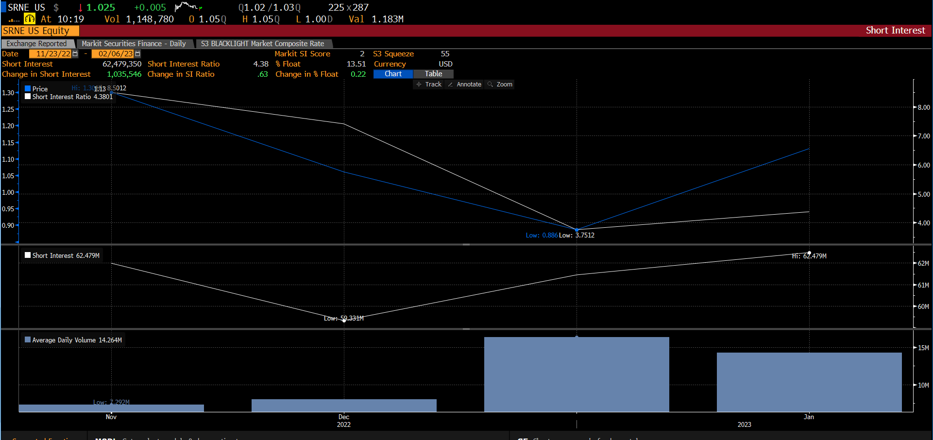So if you’re a normal shareholder of SRNE, you get some non-transferable shares of SCLX in your account…. but what happens if you’re short SRNE? Per Bloomberg, there are ~60m shares of SRNE short. The SCLX dividend ends up being ~0.141 shares of SCLX/SRNE share, so the shorts are now short ~8.5m restricted shares of SCLX (~0.141 SCLX/SRNE * 60m SRNE shares short). (Note that I came up with that number using Bloomberg; SRNE publishes a PR in early Feb. with similar short share numbers).