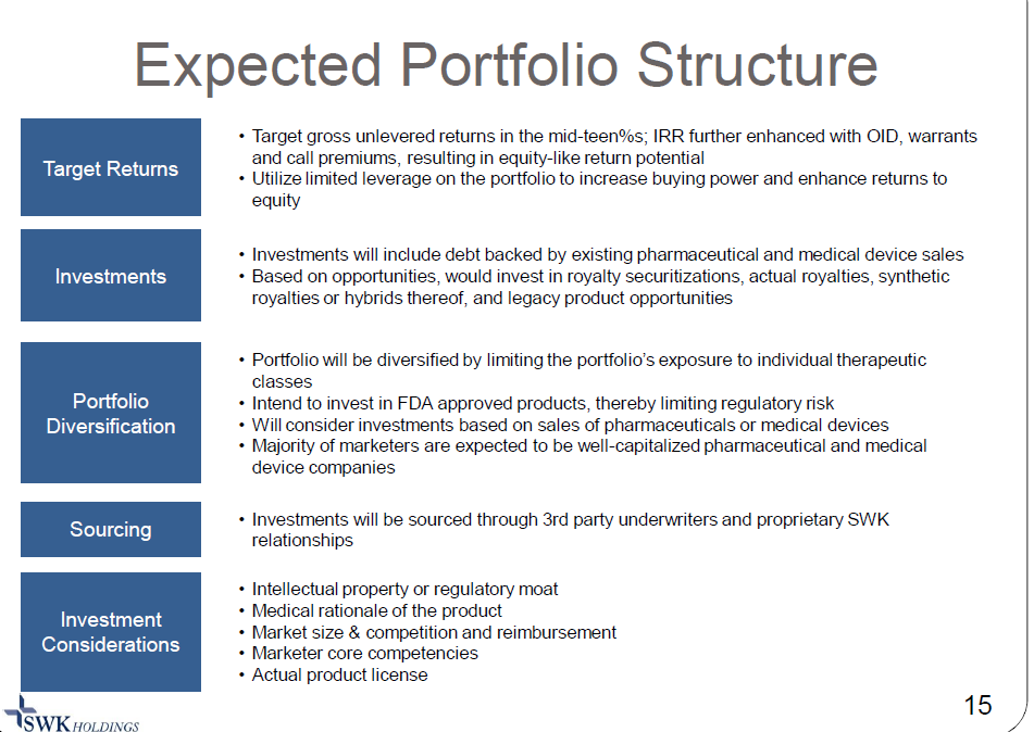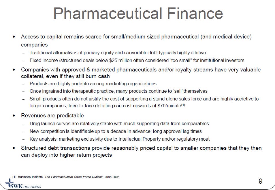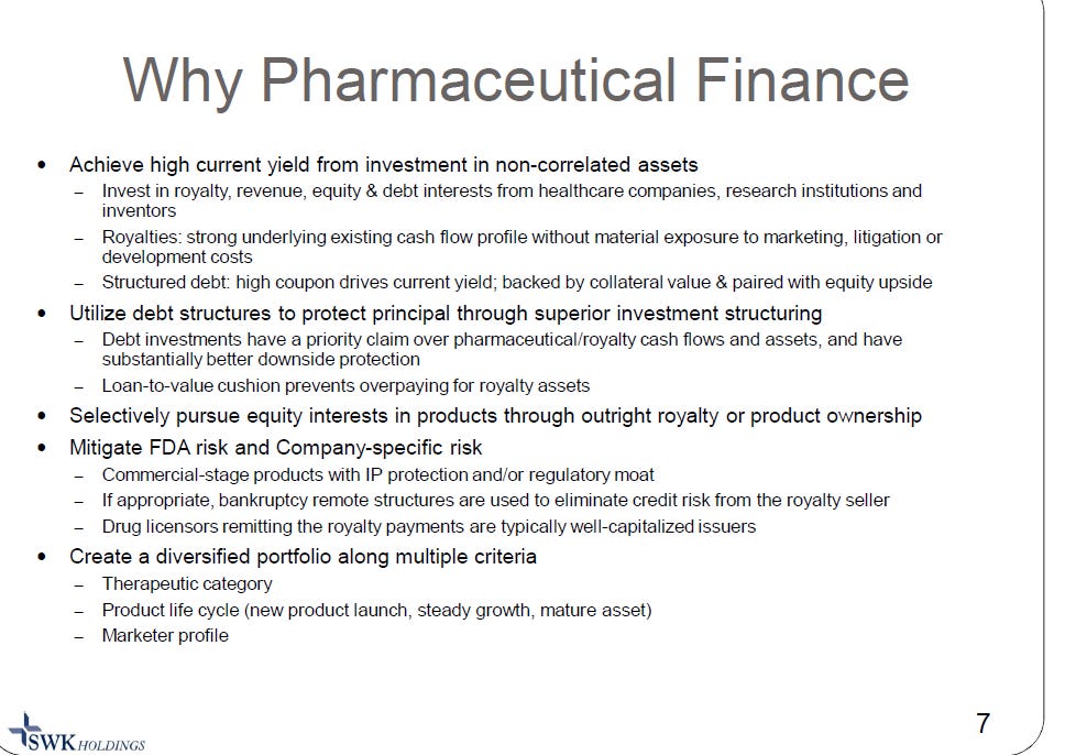 SWK is basically a giant net operating losses (NOL) shell that was taken over by Carlson Capital (owns ~70% of the company) starting in 2009. In 2012, they decided to focus on building out a specialty finance / asset management business focused on secured lending and royalty financing to healthcare companies looking to raise less than $50m, as they thought the small size made that space more inefficient. As a small investor who spends most of their time focused on smaller market cap companies, it’s certainly hard not to feel a bit for SWK and their strategy.