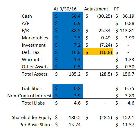 SWK has been sitting on a really large cash balance for most of the last year (~$66.4m, or ~$5/share, at 9/30/16). That cash balance acts as a drag on earnings and is super inefficient for SWK, as the bulk of their NOLs expire in 2021 and they need to put money to work / generate earnings to use those NOLs up. However, since they filed their last 10-Q, SWK has filed three 8-Ks (one, two, and three). Each 8-k contains details of new lending activity for SWK or a previous investment getting realized. In total, SWKH put ~$38m (~$2.90/share) to work across four investments as well as selling Holmdel for $8m (~$0.60/share). Per p. 13 of SWK’s most recent 10-Q, Holmdel was on SWK’s books for $7.2m, so the sale will result in a small gain for SWK.